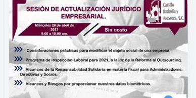 Castillo Borbolla y Asesores, S.C. te invitan a su sesión online gratuita, el próximo 28 de abril 2021 donde se dará a conocer sobre la Actualización Jurídico Empresarial del mes de abril 2021.