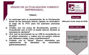 Castillo Borbolla y Asesores, S.C. te invitan a su sesión online gratuita, el próximo 13 de mayo, donde se dará a conocer sobre la Actualización Jurídico Empresarial del mes de Mayo 2020