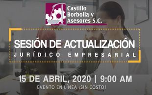 Castillo Borbolla y Asesores, S.C. te invitan a su sesión online gratuita, el próximo 15 de ABRIL, donde se dará a conocer sobre la Actualización Jurídico Empresarial del mes de Abril 2020