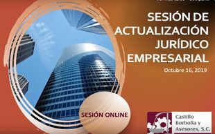 Castillo Borbolla y Asesores, S.C. te invitan a su sesión online gratuita, el próximo 16 de Octubre, donde se dará a conocer sobre la Actualización Jurídico Empresarial del mes de Octubre 2019