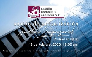 Castillo Borbolla y Asesores, S.C. te invitan a su sesión online gratuita, el próximo 19 de Febrero, donde se dará a conocer sobre la Actualización Jurídico Empresarial del mes de Febrero 2020