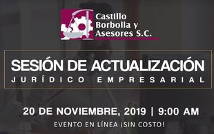 Castillo Borbolla y Asesores, S.C. te invitan a su sesión online gratuita, el próximo 20 de Noviembre, donde se dará a conocer sobre la Actualización Jurídico Empresarial del mes de Noviembre 2019