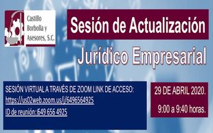 Castillo Borbolla y Asesores, S.C. te invitan a su sesión online gratuita, el próximo 29 de Abril donde se dará a conocer sobre la Actualización Jurídico Empresarial del mes de abril 2020