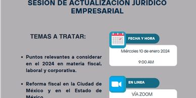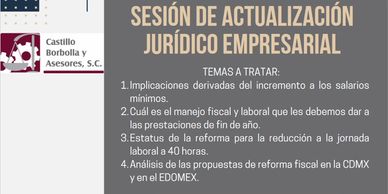 Castillo Borbolla y Asesores, S.C. te invitan a su sesión online gratuita, el próximo 10 de enero de 2024 donde se dará a conocer sobre la Actualización Jurídico Empresarial del mes de diciembre 2024.